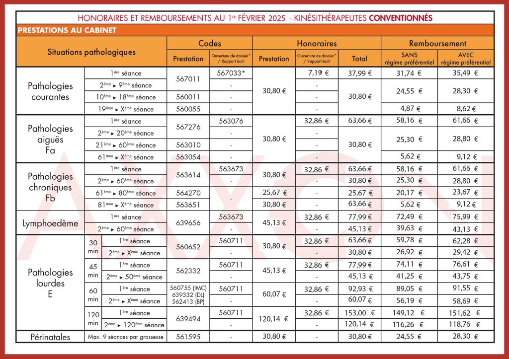 Le tarif d’une séance (30 minutes) varie en fonction de plusieurs facteurs: nombre de séances déjà effectuées au cours de la même année civile, pathologie courante/chronique/lourde/postopératoire etc. N’hésitez pas à contacter votre mutuelle pour en savoir plus. Ou le site de l’INAMI. Mais en général, le coût d’une séance est d’environs 30.8 euros (remboursés en grande partie selon votre statut).